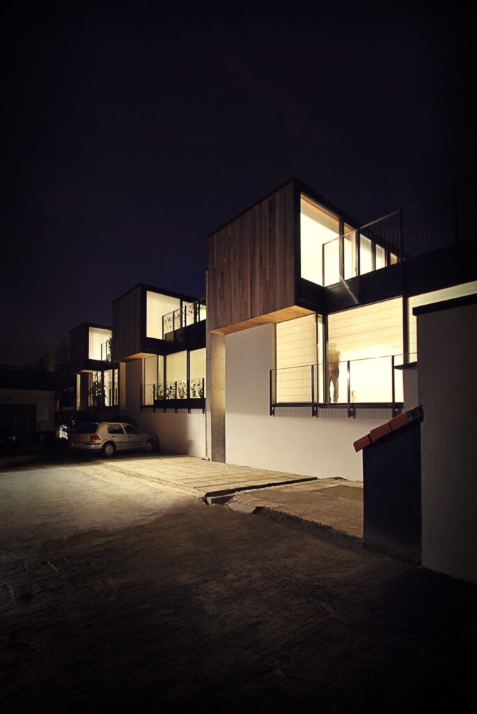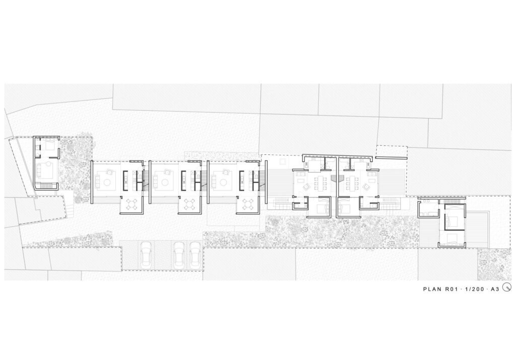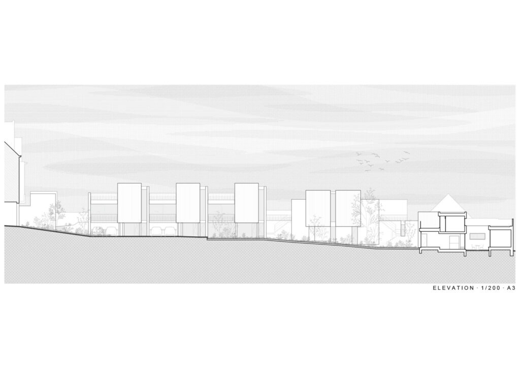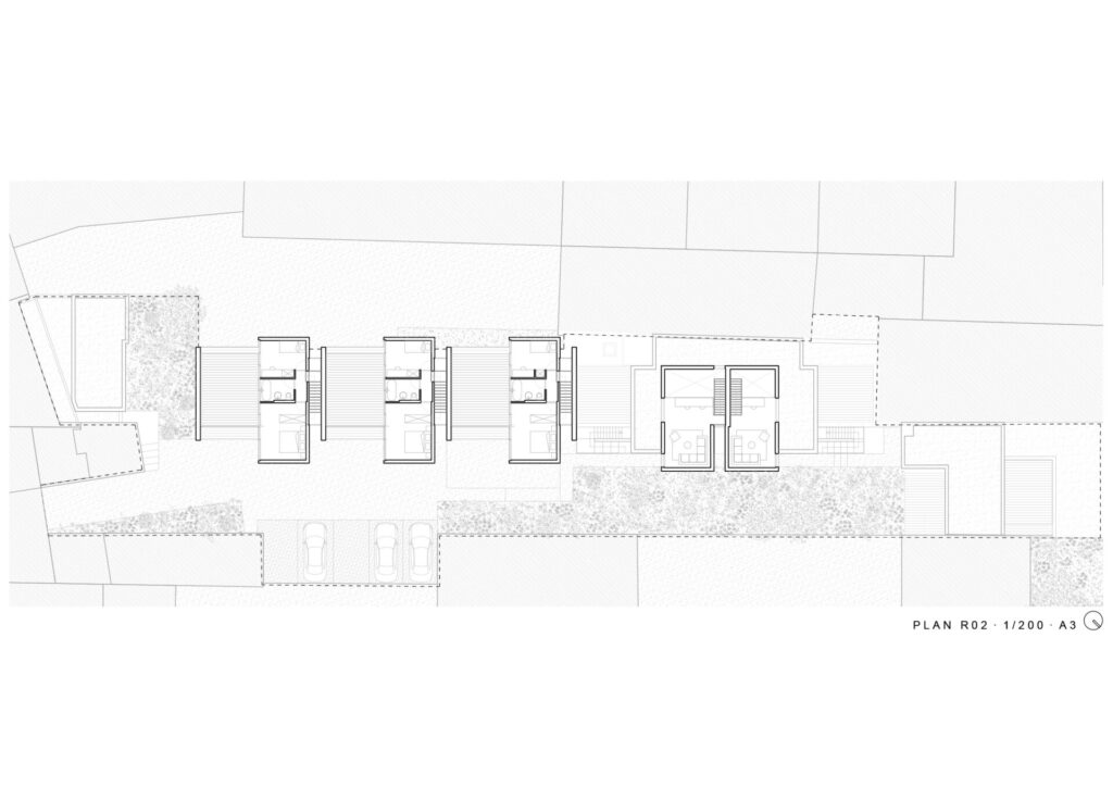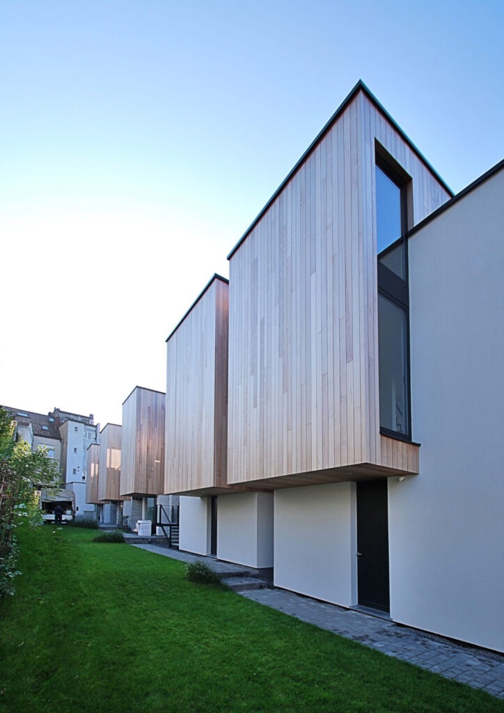 Une composition en peigne, entre mitoyens, ouvre des cours et des terrasses qui amènent le soleil au cœur des logements et protègent les espaces extérieurs des vues directes. Le parking sauvage laisse place à un socle planté: les voitures s’arrêtent en entrée de parcelle, le reste du site devient jardin partagé. La démarche s’appuie sur une forte concertation avec le voisinage, qui a conduit à ajuster vues, cours et répartitions de terrasses, et a déclenché la rénovation de plusieurs façades voisines. L’éco-construction se traduit par une ossature bois, des isolants en flocons de papier recyclé, la récupération d’eau de pluie et une végétalisation des garde-corps et jardins, qui réintroduisent de la biodiversité dans l’îlot.