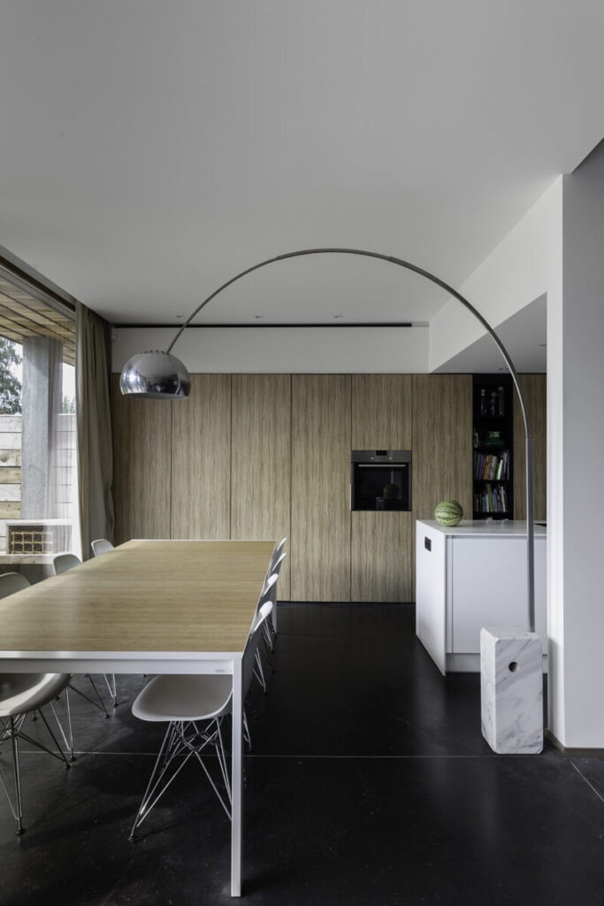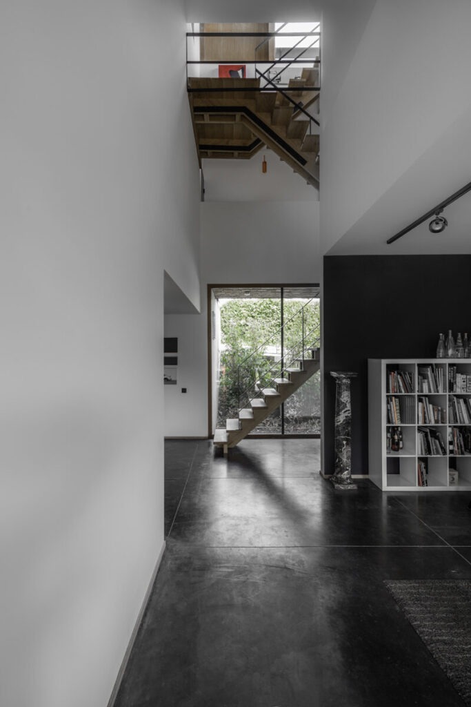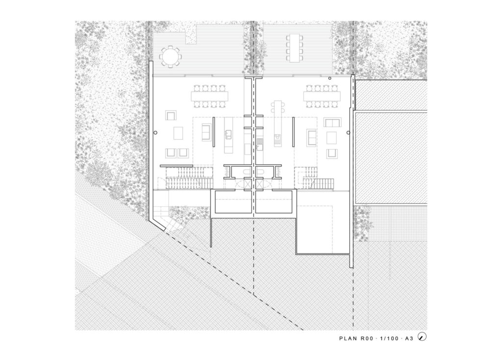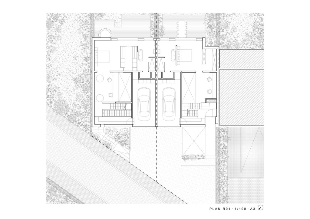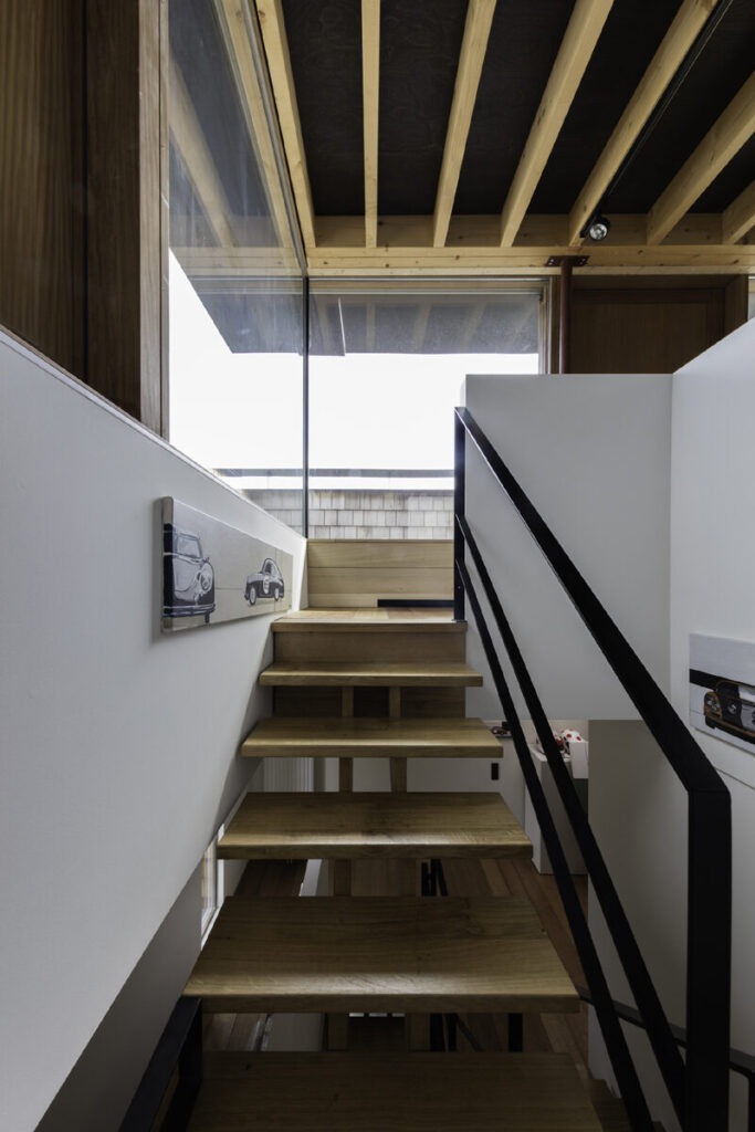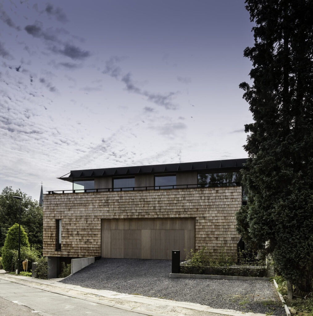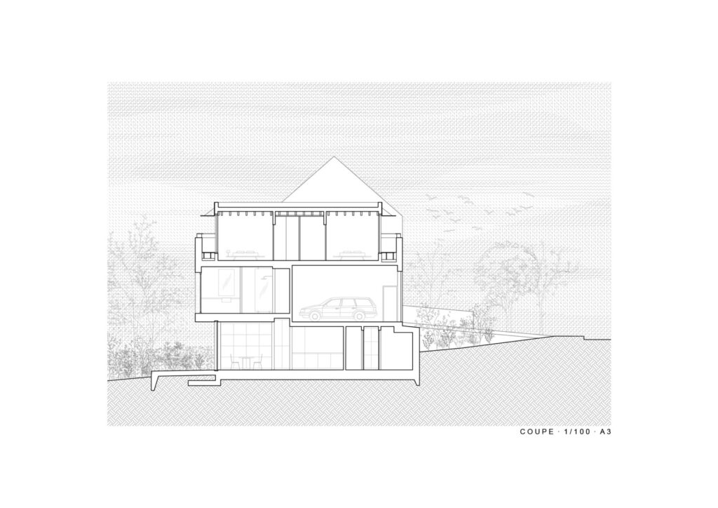 Bien que le programme prévoie d’installer deux familles dans la maison, celle-ci présente une volumétrie unie assez particulière. En effet, le terrain ayant une forte déclivité, la construction gagne un étage côté jardin (R+2) et semble glisser sous la maison. Le volume central en bois flotte au-dessus du volume inférieur, tout vitré. Celui-ci se prolonge au-dessus du volume bardé de tuiles de bois, et vient le coiffer d’un étage rythmé par des fenêtres à châssis coulissants.