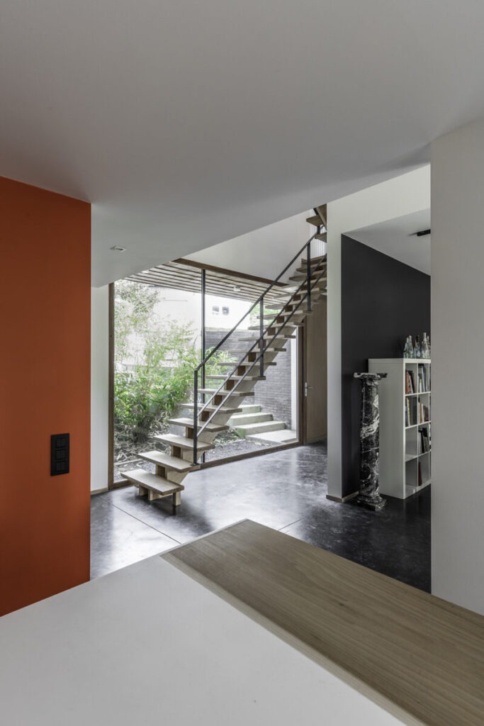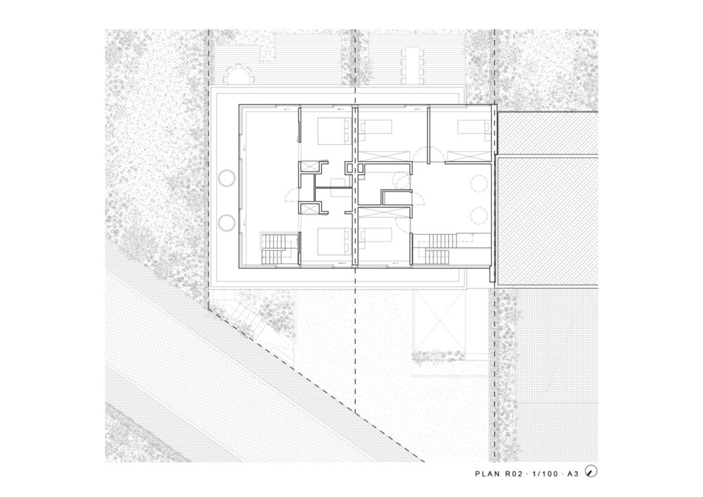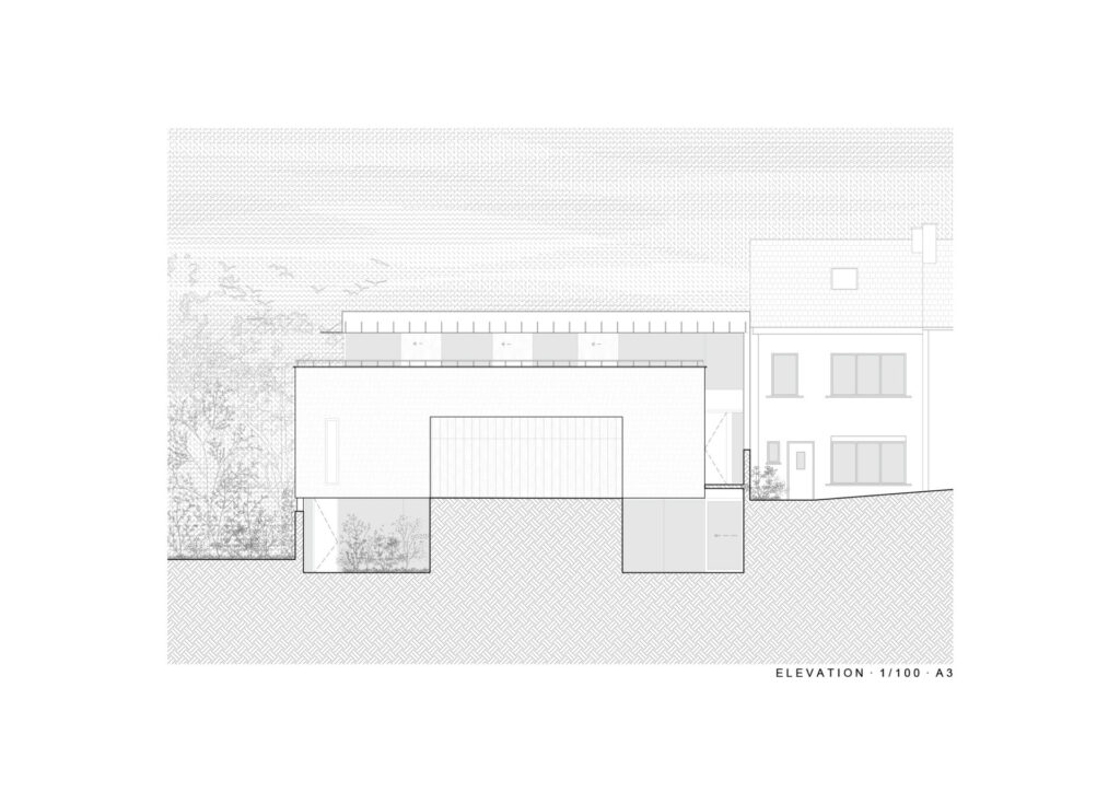 Côté rue, le bâtiment vient s’implanter dans la continuité et l’alignement du front bâti des maisons mitoyennes voisines présentant une grande variété de typologies. Le gabarit se conforme à l’ensemble de ces maisons, souvent de type pavillonnaire, R+1 et vient fermer, comme un about, l’ordre continu des habitations voisines.