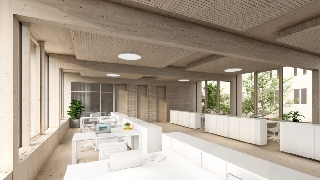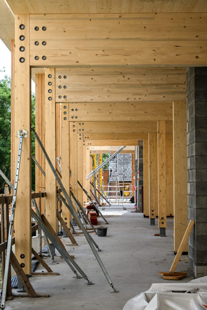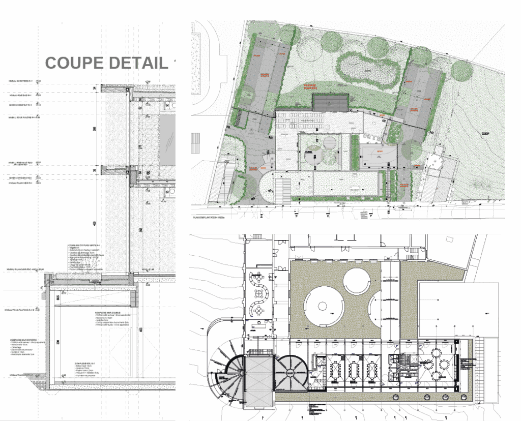 L’intervention combine conservation ciblée, démolition partielle et constructions neuves en structure bois démontable. Le projet s’appuie sur le réemploi des briques, pavés et agrégats, l’introduction de murs en terre crue, des dispositifs d’infiltration douce pour les eaux pluviales et un parking perméable. Les performances énergétiques sont étudiées par simulation dynamique, afin d’ajuster les niveaux d’isolation et de limiter les besoins techniques. Accessibilité, acoustique et mobilier intégré sont travaillés dès l’esquisse pour offrir un cadre confortable et lisible dans un site patrimonial complexe.