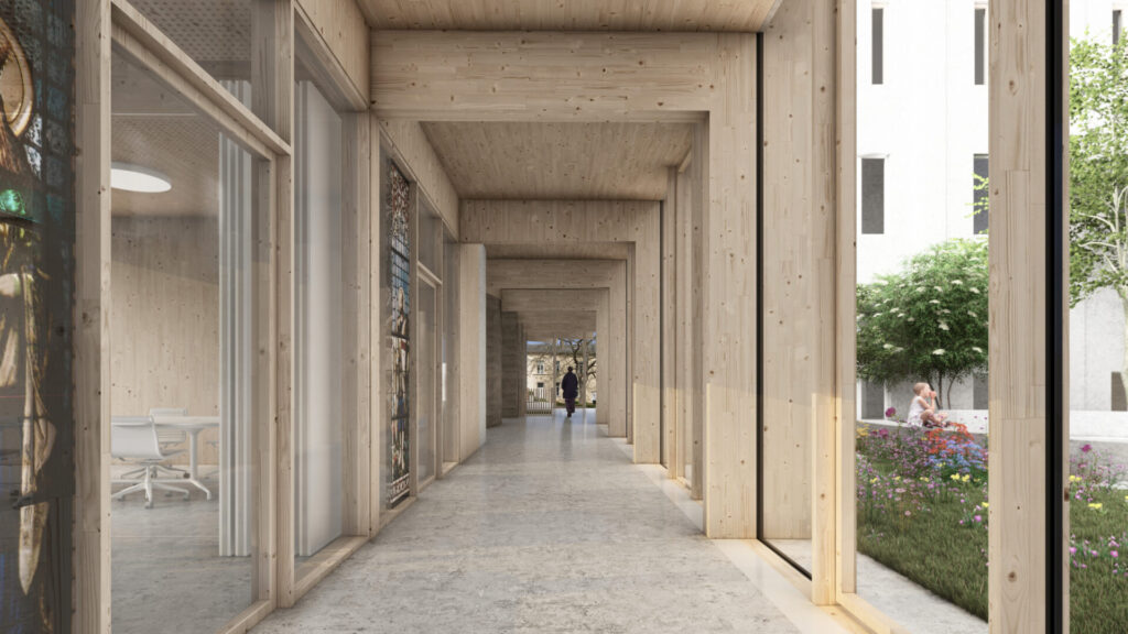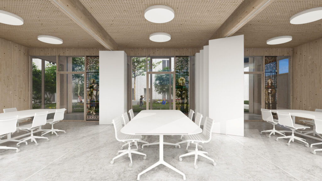 Le projet transforme l’évêché de Wavre en un centre multifonctionnel ouvert sur la ville, tout en maintenant les activités sur site pendant les travaux. Crèche, bibliothèque, espaces paroissiaux, bureaux, salle polyvalente et studios multimédias se réorganisent autour d’un nouveau cloître et d’un jardin intérieur qui clarifient les parcours et articulent les différents publics. La double façade met en relation l’espace urbain et un cœur d’îlot plus calme, où les fonctions spirituelles et culturelles trouvent leur place.