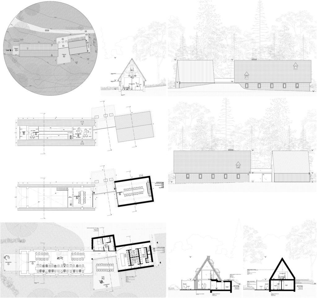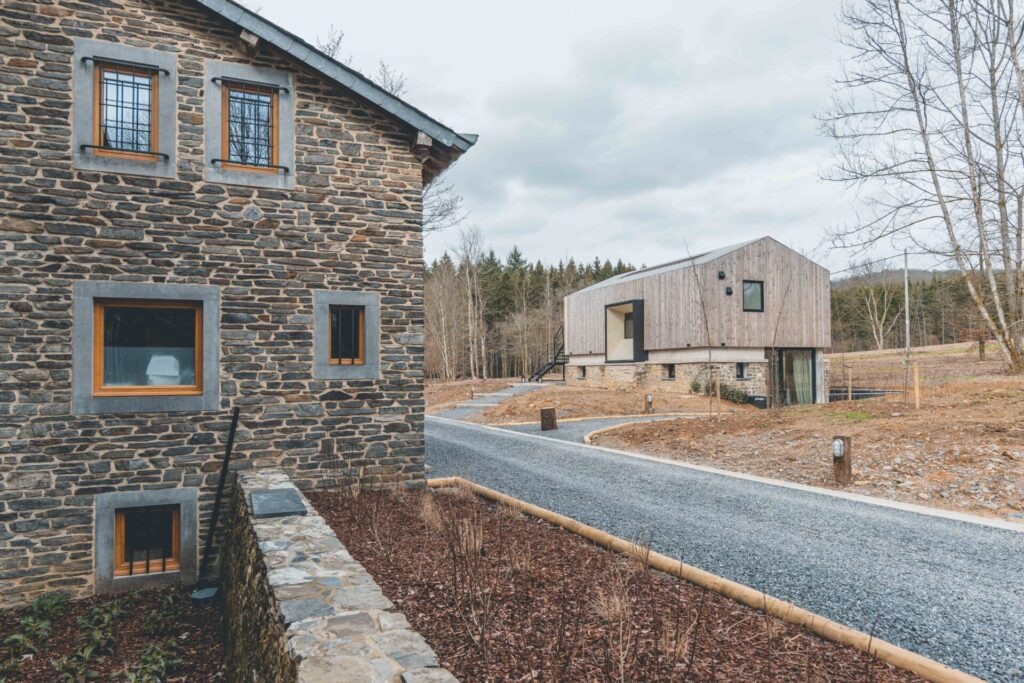 Notre rôle d’architecte a débuté en amont, en accompagnant le maître d’ouvrage dans l’offre d’achat du domaine à la Région wallonne, incluant un projet écotouristique public, structurant pour la région. La transformation s’appuie sur une analyse fine du bâti, conservant ses qualités, renforçant l’enveloppe (laine de bois, châssis en chêne restaurés ou remplacés à l’identique). Les extensions en CLT et charpente bois proviennent d’un circuit court via Fidus. Le projet intègre l’accessibilité (chambre PMR, signalétique adaptée), les normes incendie, l’acoustique, sans ascenseur. Le site est reconfiguré sans abattre d’arbres de qualité, avec un parking perméable paysager. Le traitement des eaux sanitaires est assuré sur place, en cohérence avec les zones inondables, et les eaux pluviales sont gérées de manière douce. Nous avons piloté un chantier en lots séparés, dans un planning contraint par les impératifs de financement, avec une coordination étroite et des décisions techniques rapides.