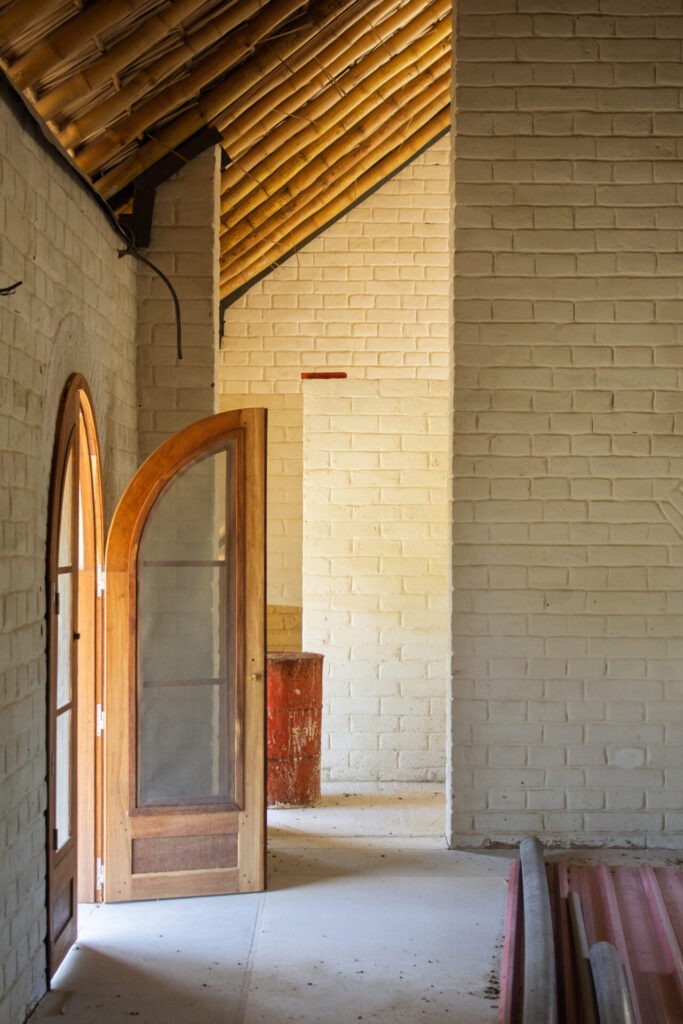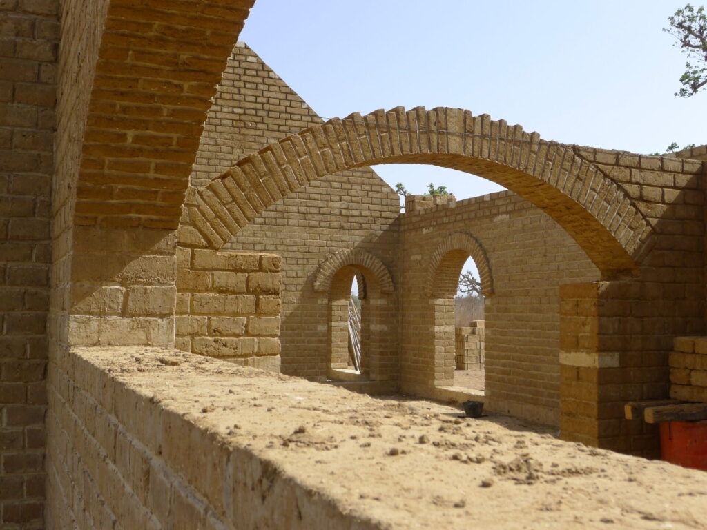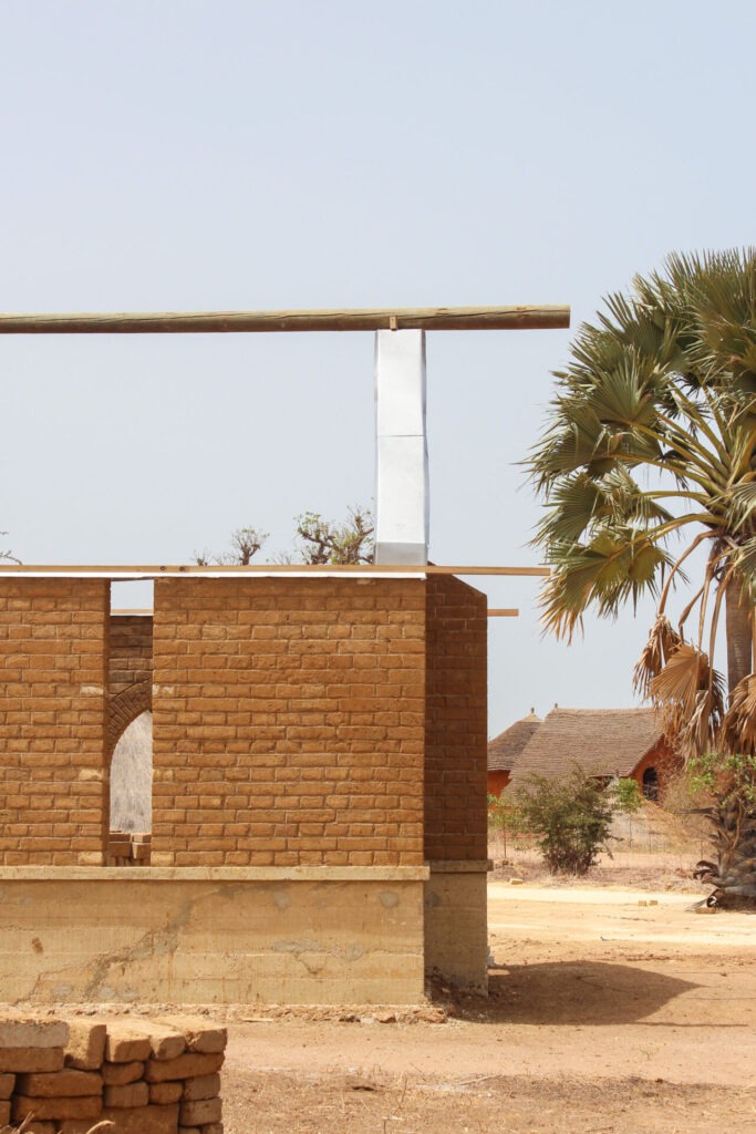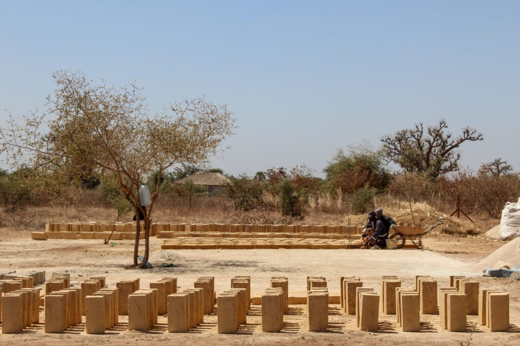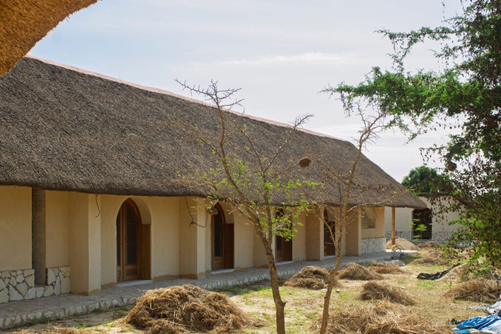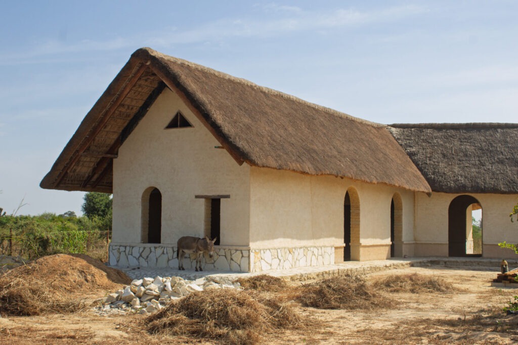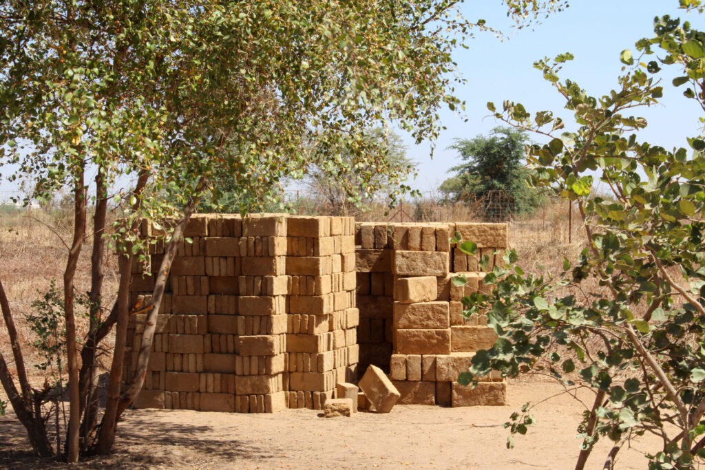 Les bâtiments reposent sur une base commune: fondations en béton cyclopéen, sols en terre et murs massifs en adobe réalisés avec la terre argileuse du terrain, sans recours au ciment. Leur toiture légère en chaume de typha, posées sur les murs pigons, complète l’approche bioclimatique en apportant ombre, inertie et ventilation naturelle. Les systèmes constructifs restent volontairement simples et accessibles, privilégiant des solutions performantes et des savoir faire locaux qui s’inscrivent naturellement dans le contexte social et environnemental du site.
