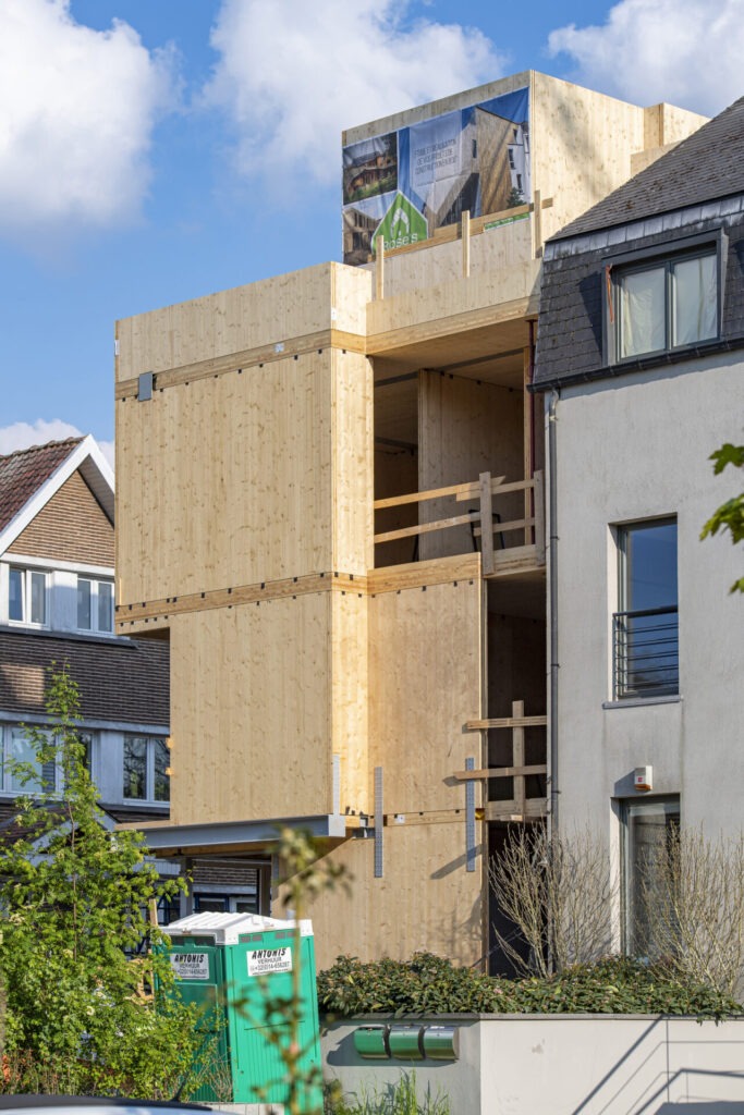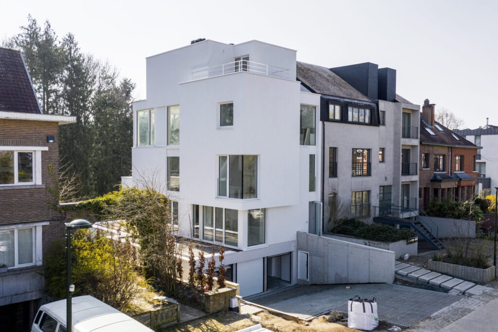 La composition architecturale du bâtiment repose sur un jeu de pleins et de vides, en rapport avec l’orientation, la gestion de l’eau, le rythme des ouvertures et les bâtiments voisins existants. La façade nord-est (côté rue) est composée essentiellement de pleins, tandis que les façades sud-est et sud-ouest sont plus généreusement vitrées et munies de pare-soleil de type screen.