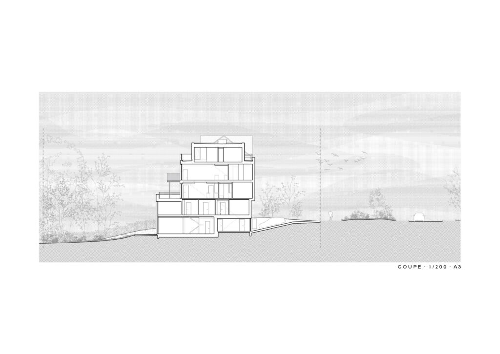 Cette conception architecturale vise à optimiser la gestion de l’espace, de la lumière et des vues, tout en respectant les contraintes environnementales et urbaines du site.