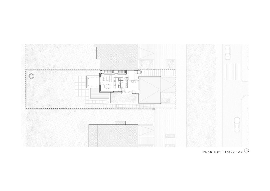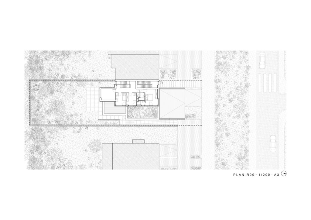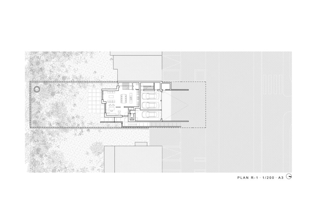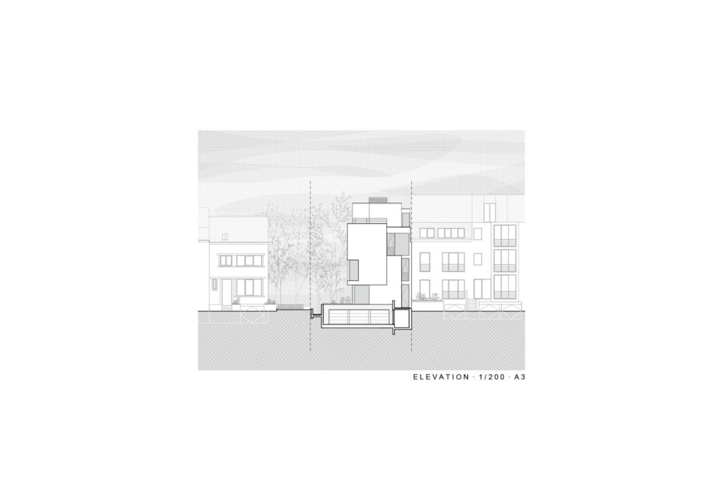 La déclivité du terrain permet de tirer parti d’un rez-de-chaussée et d’un rez-de-jardin. La partie avant, comprenant les caves, le local poubelle, le parking voitures et vélos, est enterrée. L’enveloppe solide qui ferme les trois logements est prolongée et mise à distance du sol et de la rue par une série de tampons.