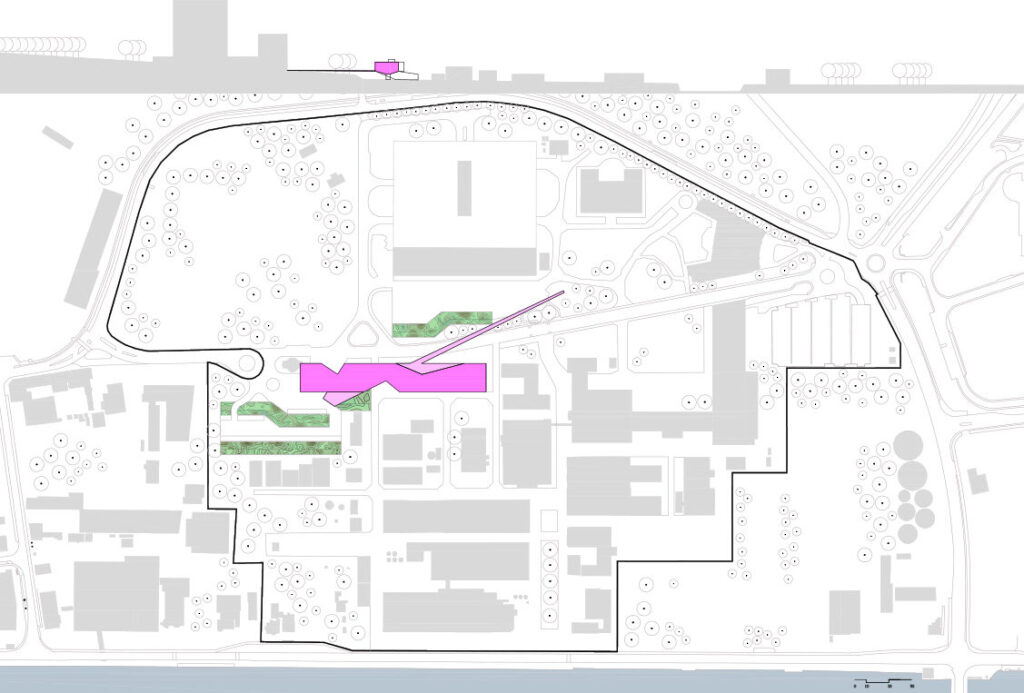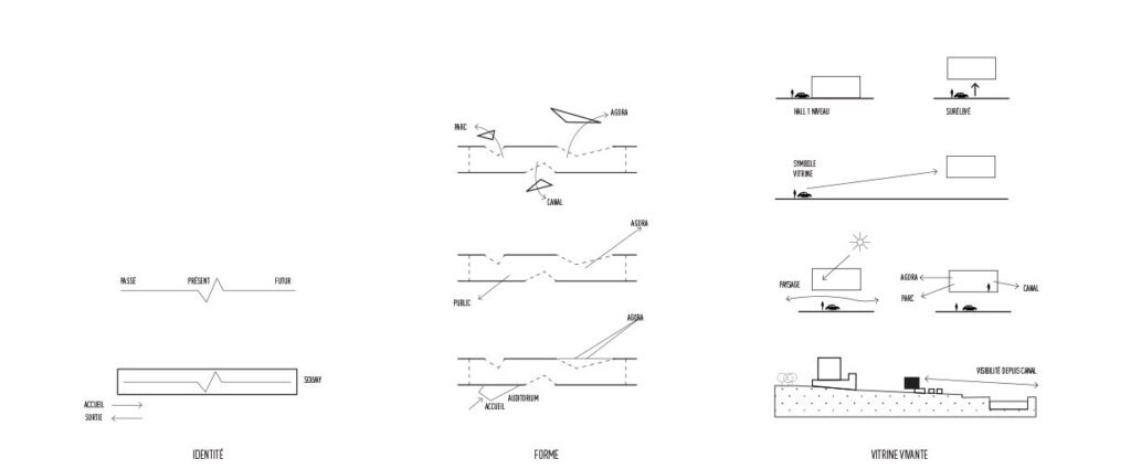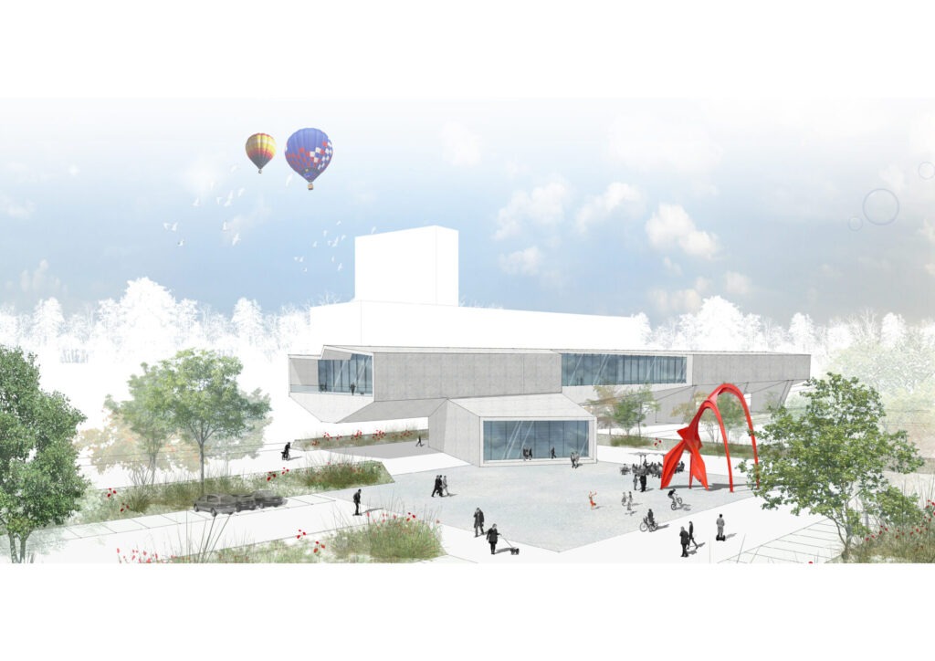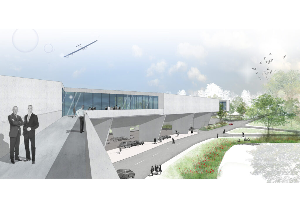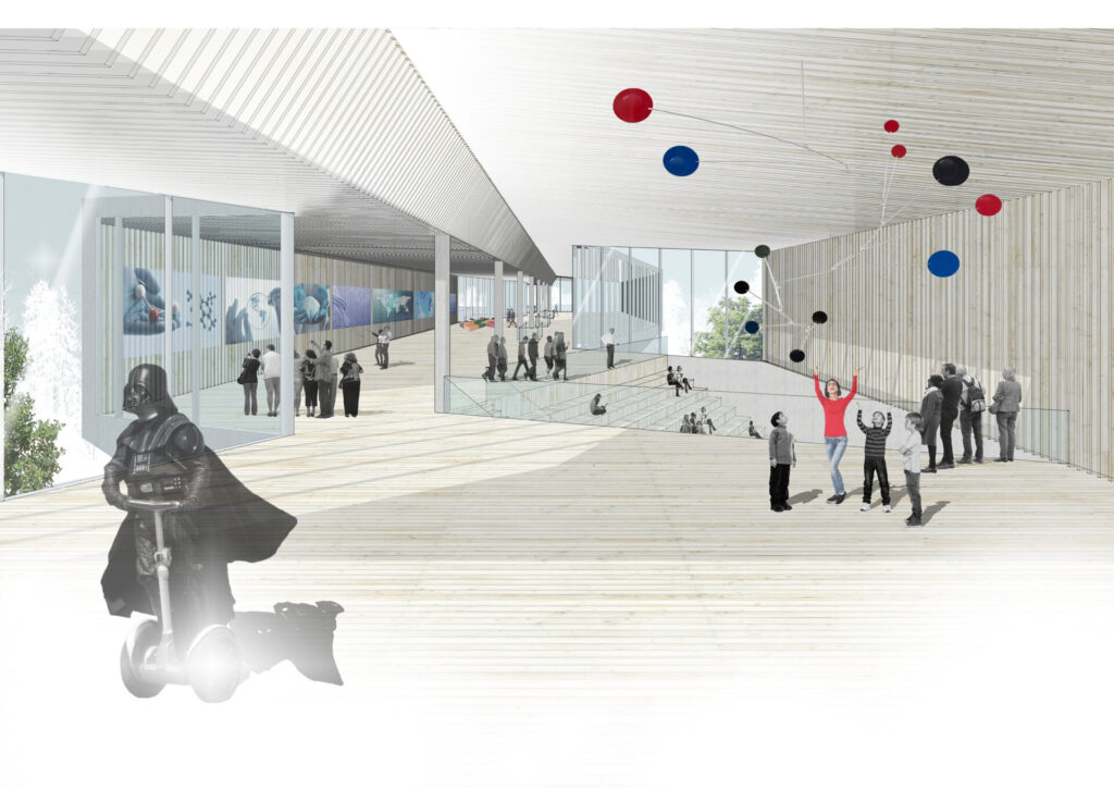 La création de talus encadrant l’espace réservé aux visiteurs permet d’obtenir un jeu de relief mettant en valeur la plantation d’arbres et d’arbustes. Des espèces indigènes comme le Chêne (Quercus robur), le Tilleul (Tilia cordata) et le Merisier (Prunus avium) donneront cette ombre et cette fraîcheur naturelle, indispensables au bon accueil des visiteurs. L’entrée de l’auditorium est précédée d’une place créant un point de rencontre et permettant le développement d’activités diverses, toujours dans le cadre d’une flexibilité d’organisation. Ce lieu de vie et d’échange s’inscrit aussi dans la volonté de refléter la société évoluant sur place et permet l’évolution de cette dynamique sans cesse en mouvement.