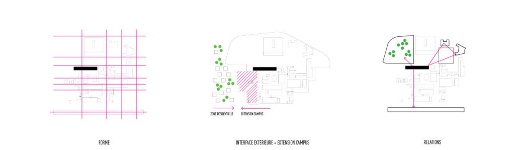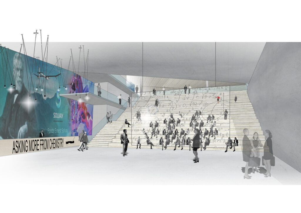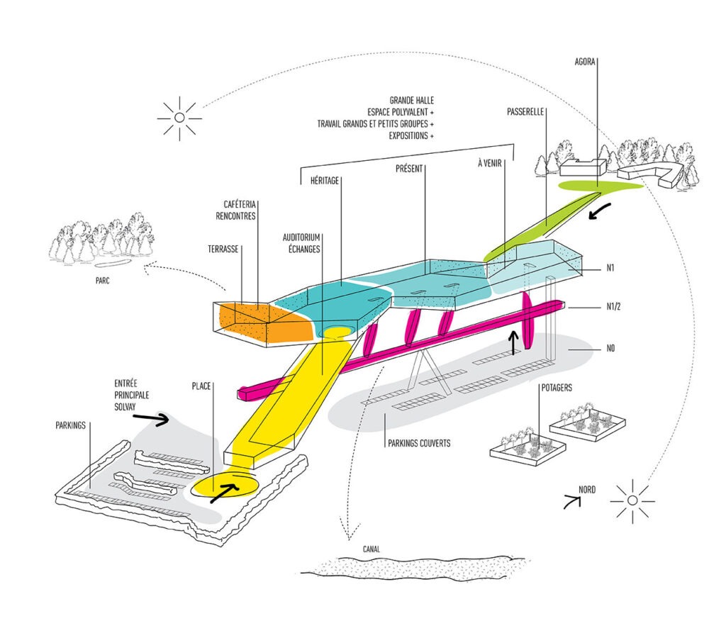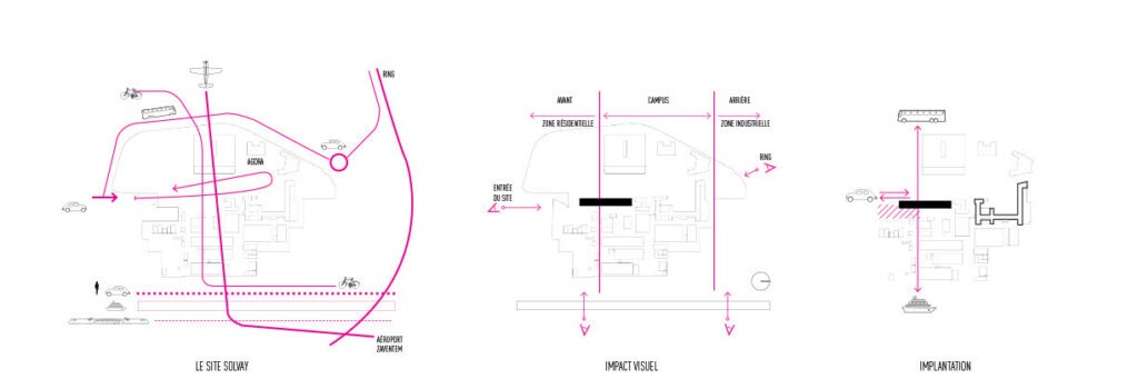 L’approche paysagère qui entoure le forum Solvay est agencée de manière à retrouver différents acteurs et différentes fonctions. Le plan paysager répond à une dimension de taille humaine et offre une flexibilité logique, attenante au site. Cela se traduit premièrement par un espace de stationnement répondant aux besoins journaliers, en connexion directe avec le pavillon d’accueil. D’autre part, on retrouve aussi des places réservées aux fournisseurs mais pouvant également recevoir des bus ou des voitures supplémentaires, afin de s’accorder au nombre de personnes présentes sur le site.