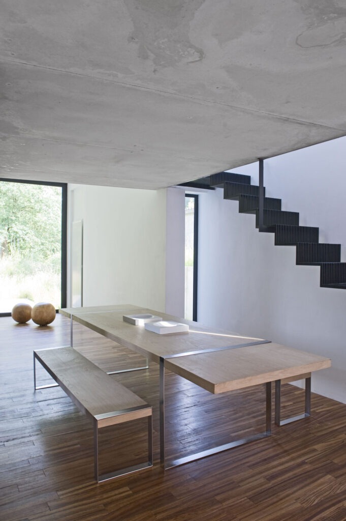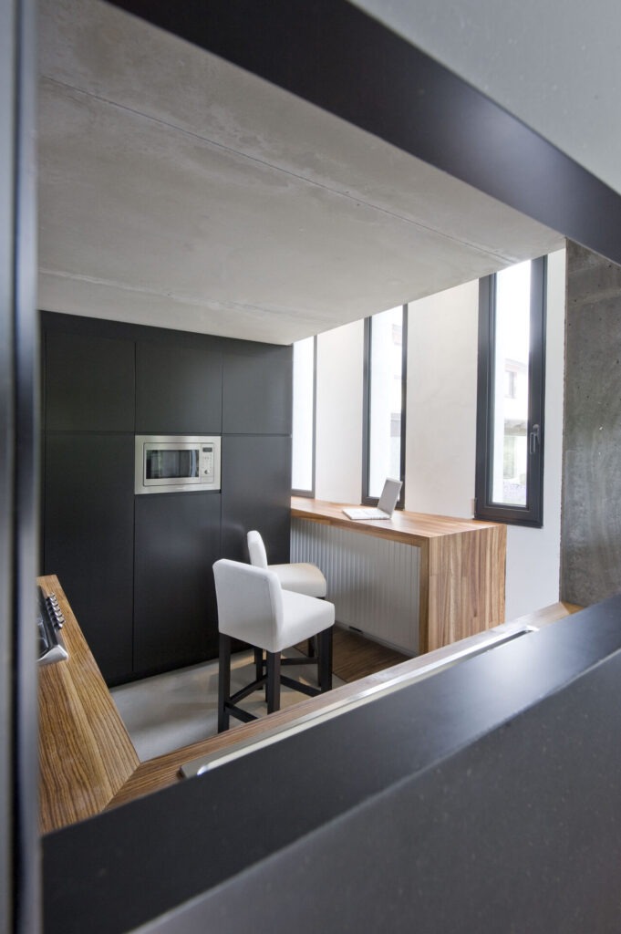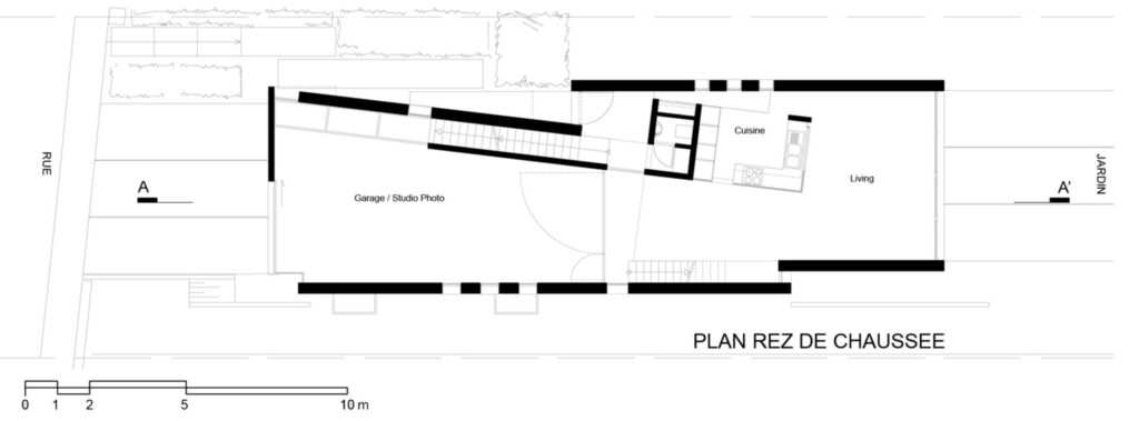 Les grandes baies côté rue et côté jardin prolongent les vues, tandis que les façades latérales restent plus fermées pour préserver l’intimité des voisins. L’entrée longe un mur oblique qui reprend la focale du studio; un meuble mobile permet de moduler l’espace et d’augmenter le recul du photographe. L’absence de parois parallèles à la rue offre différentes profondeurs de champ: rue, jardin ou intérieur, et la grande porte en acier Corten transforme ponctuellement l’habitation en galerie.