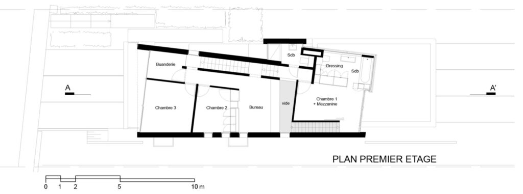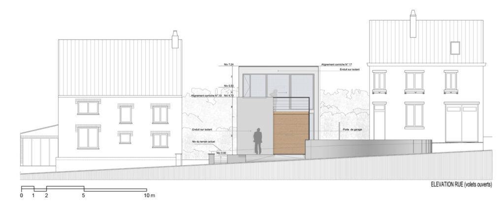 Les volumes s’alignent sur les constructions voisines et assurent une transition entre deux architectures très différentes du quartier. Matériaux et couleurs ancrent la maison dans son contexte tout en affirmant une écriture contemporaine.