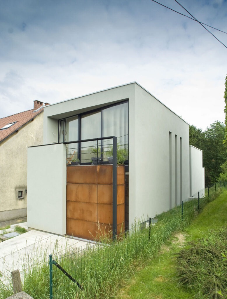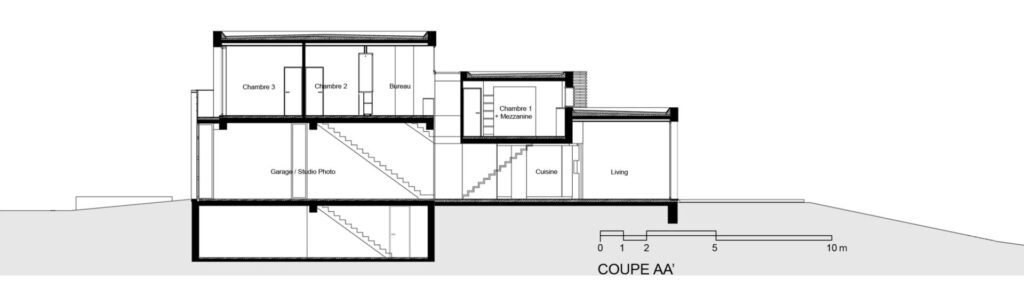La maison se situe à Rixensart, dans une rue aux gabarits et alignements variés, marquée par l’alternance entre mitoyens et villas. Construite sur une parcelle longue et étroite, elle s’ouvre vers la vallée comme un objectif photographique, en lien direct avec l’usage de son atelier.